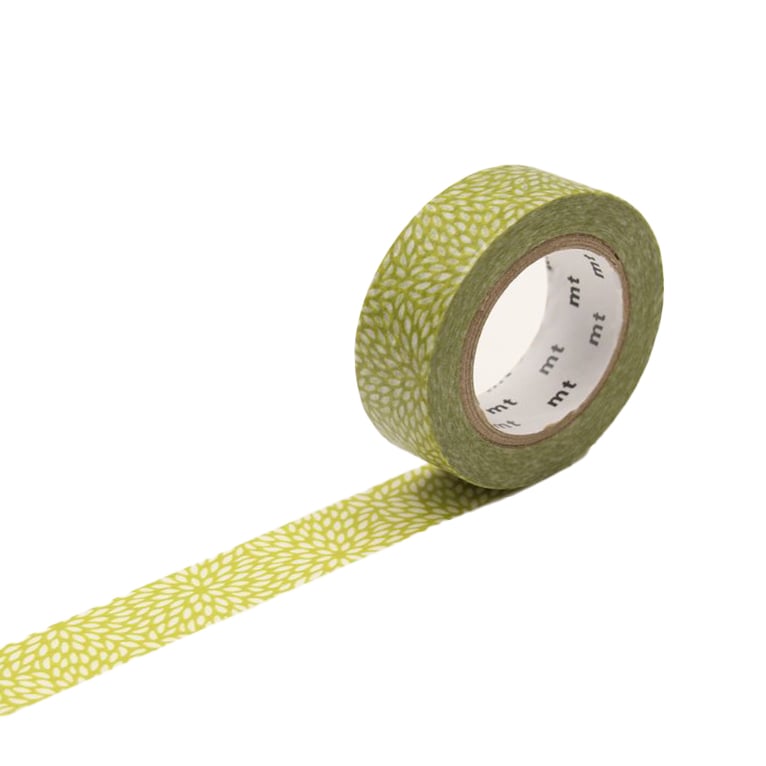 Rolls of MT masking tape featuring botanical Petals Mujinagiku Hiwa Green pattern